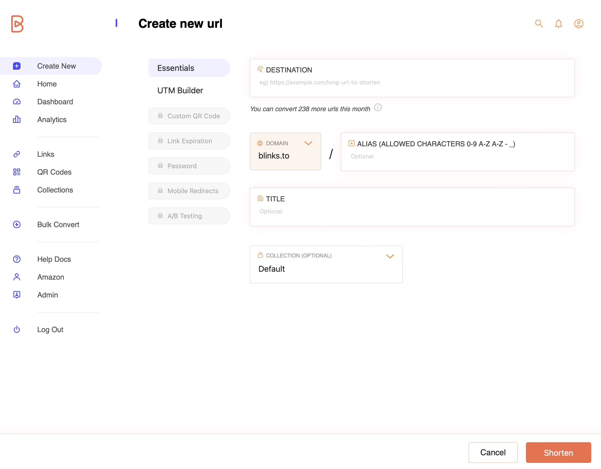 The 'Create URL' page, where this takes place, closely resembles the 'Edit URL' page. However, in this scenario, you initiate the process by inputting the long destination URL and then proceed to fill in the necessary details before converting it. For comprehensive guidance on how to populate the required fields, please refer to the 'Customizing Your URL' section of our help documentation.