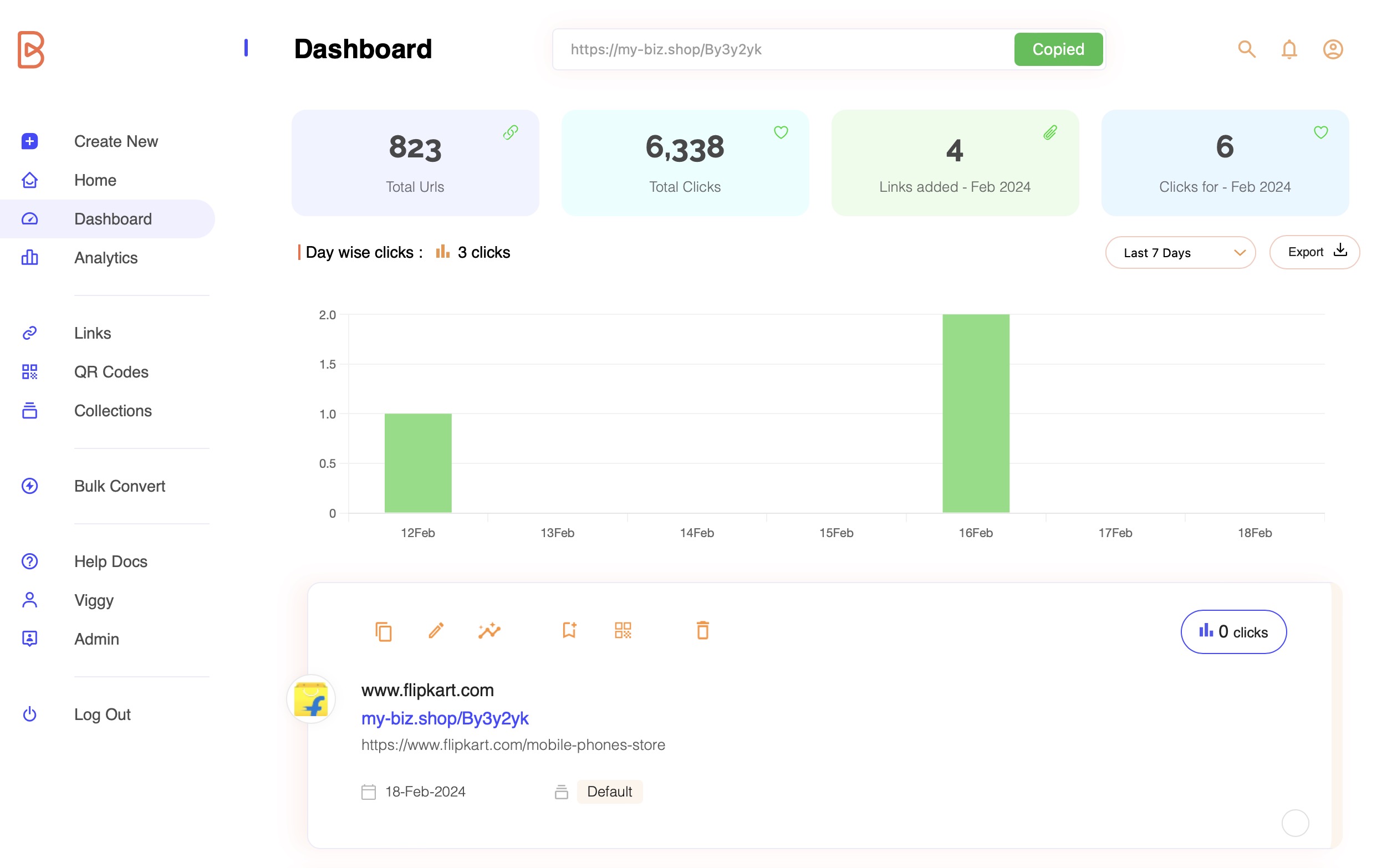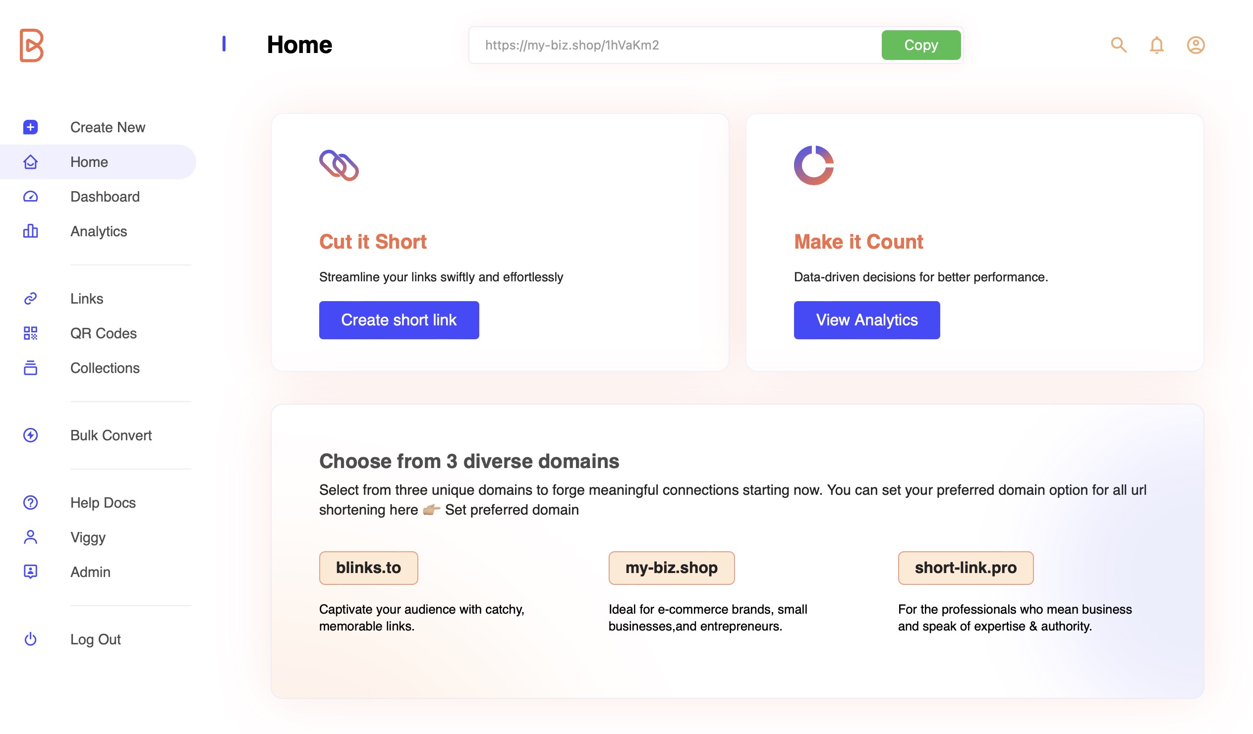 <figure><img src="https://2213782032-files.gitbook.io/~/files/v0/b/gitbook-x-prod.appspot.com/o/spaces%2FcuQD9bKpuaPH1WnZJ9Zl%2Fuploads%2FrmynwNrp2ZALwydiRXHv%2Fdashboard%20after%20converting.jpg?alt=media&#x26;token=cddfd987-5567-4c28-a35b-d1a8dce76427" alt=""><figcaption><p>Img 5. Dashboard view: Newly shortened url below metrics</p></figcaption></figure>